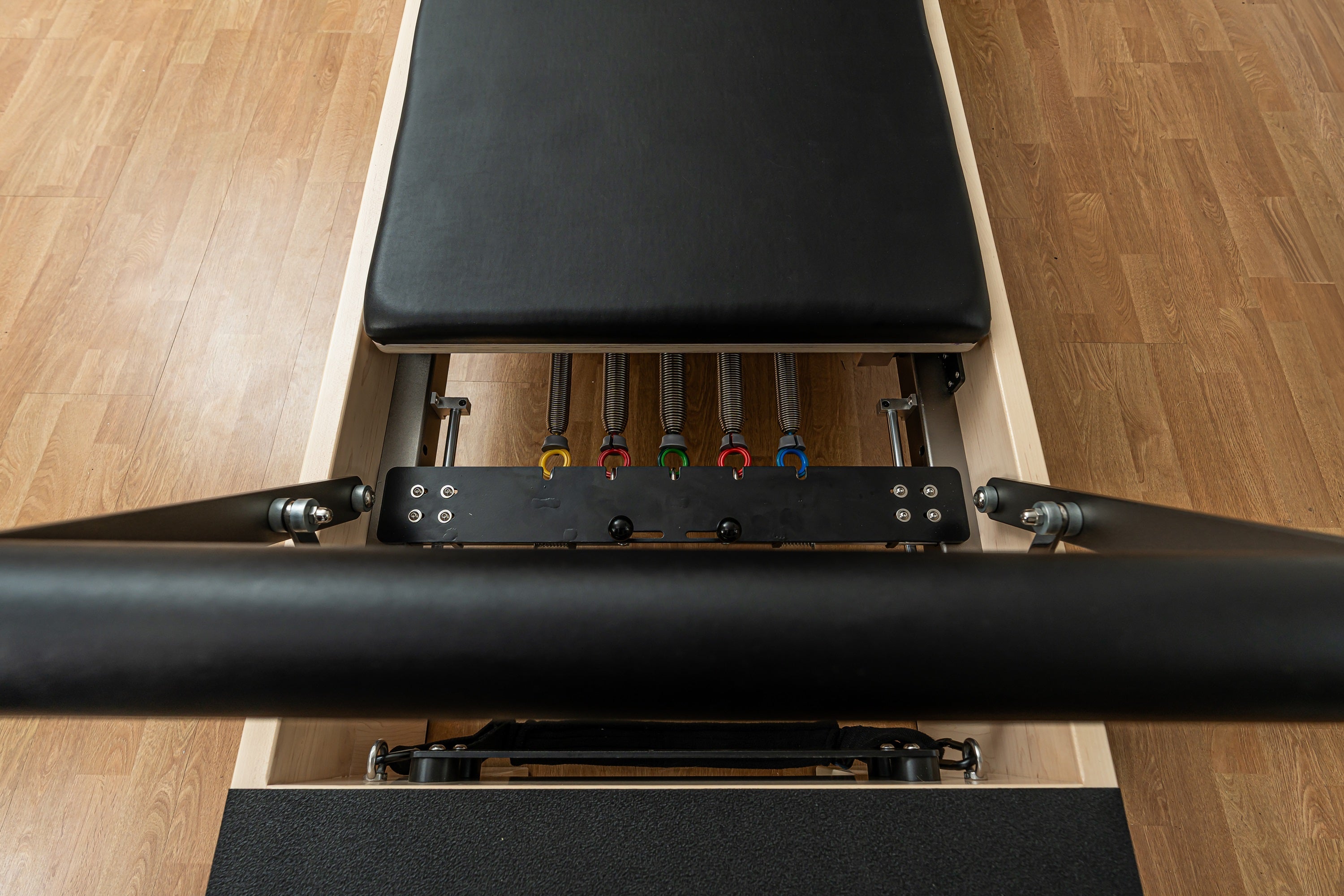 Most studio reformers require lifting a heavy gearbar with two hands which is awkward, bulky, and difficult for many users. The Monarch uses a simple block-style system that lifts with one finger, letting you change resistance quickly and comfortably.